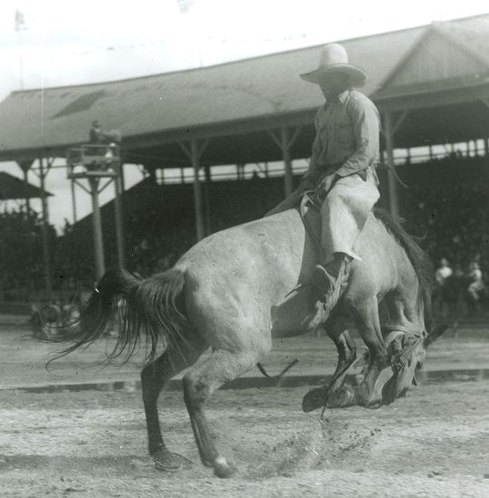 A 1912 rodeo in Salinas, CA brought Jesse one of his most fearsome opponents, a bucking bronc forebodingly named Glass Eye. This unbroken horse terrified other competitors, but Jesse handled the gravity-defying ride with such ease, he even had time to ham it up.