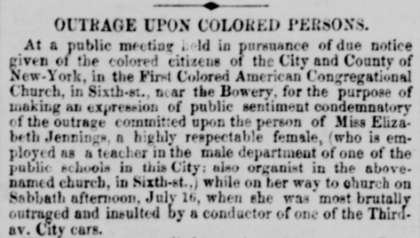 Elizabeth Jennings was the daughter of Thomas Jennings, the first Black person awarded a United States patent, owner of a profitable tailoring business, and a founder of THE Abyssinian Baptist Church, currently active in Harlem.