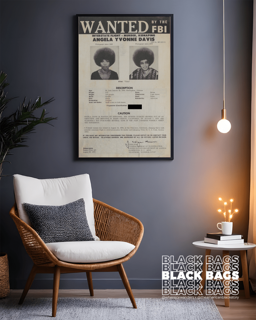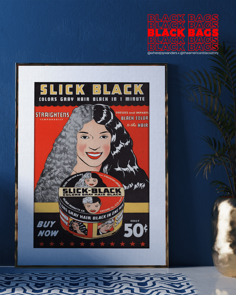 In my case, that’s an original Angela Davis FBI wanted poster and a 1930’s Slick Black hair product ad, two of my most prized BLK MKT Vintage finds.