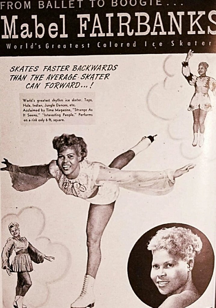 Mabel skated her way through interracial ice tours and USO clubs in France, Germany, Cuba, Japan, and all over the world before coming back to the States as a bonafide star. Her show included flying splits and other death-defying jumps, wildly flexible grabs, and unbelievable balance through it all. When she took that show to Vegas, celebrities and Hollywood flocked to witness Mabel’s talent unlike they had ever seen before, and certainly unlike they’d been allowed to see before from a Black woman.